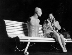 Elle regarde autour d’elle. La jetée est déserte. Elle pose le buste sur le banc. Elle dispose un petit bouquet de fleurs devant le buste. Elle recule de quelques pas. Elle joue les coquettes. Elle va s'asseoir sur le banc. Elle se met à converser avec le buste..